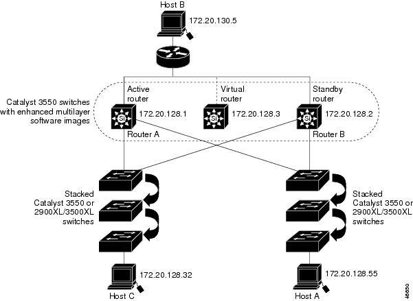 You can configure multiple Hot Standby groups among Catalyst 3550 switches that are operating in Layer 3 to make more use of the redundant routers. To do so, specify a group number for each Hot Standby command group you configure for an interface. For example, you might configure an interface on switch 1 as an active router and one on switch 2 as a standby router and also configure another interface on switch 2 as an active router with another interface on switch 1 as its standby router.